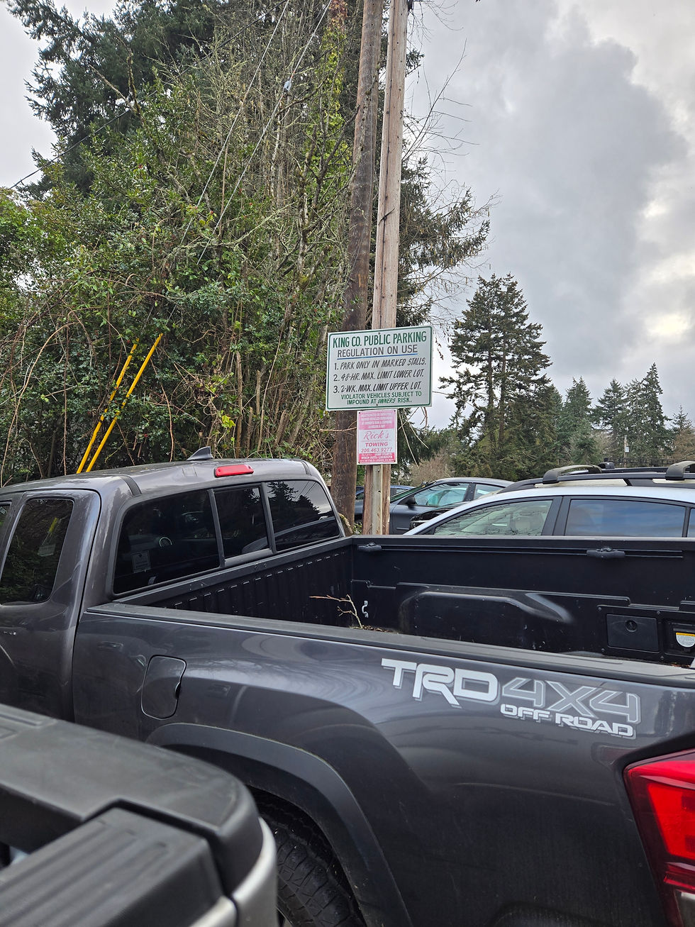 This view of drop off and pick up sign on 103rd Ave SW shows that people are expected to use the Park and Ride parking lot for dropping off and picking up people, but many people park on 103rd Ave SW instead of using the parking lot, maybe because there are rarely parking places available in the lower parking lot, and more walking distance is required for those being dropped off or picked up.